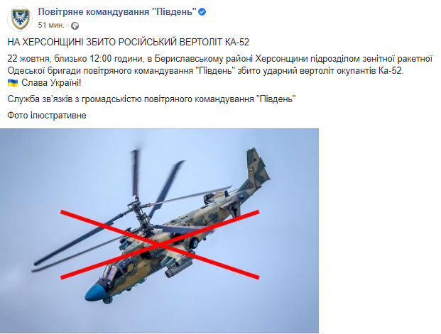 "Около 12:00 часов, в Бериславском районе Херсонщины подразделением зенитной ракетной Одесской бригады воздушного командования "Юг" сбит ударный вертолет оккупантов Ка-52", – говорится в сообщении.