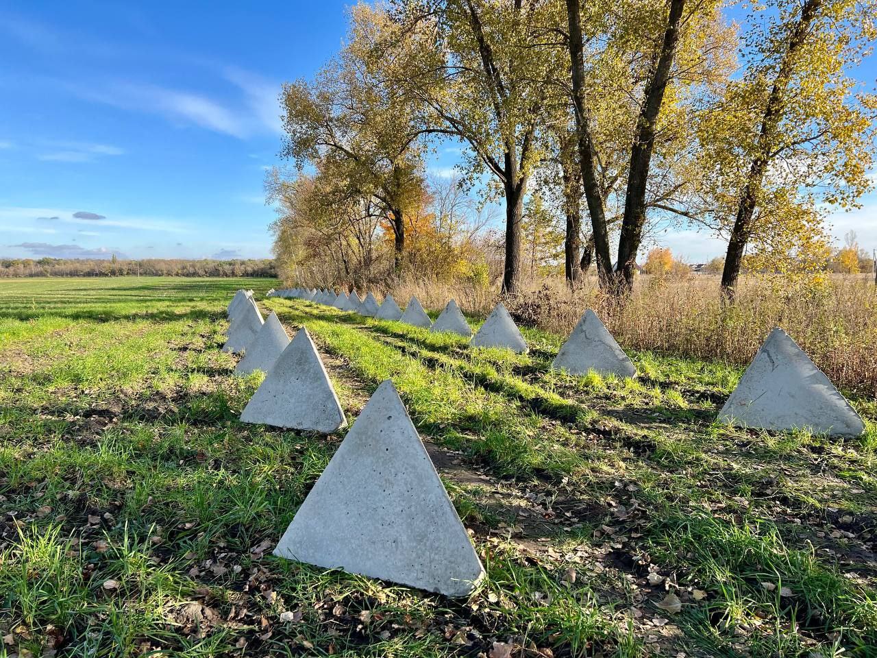 Укрепление тянется на два километра и состоит из четырех рядов цементных пирамид, которые, как надеются россияне, не дадут украинской технике и танкам двигаться на восток. За противотанковыми укреплениями находится большая траншея.
