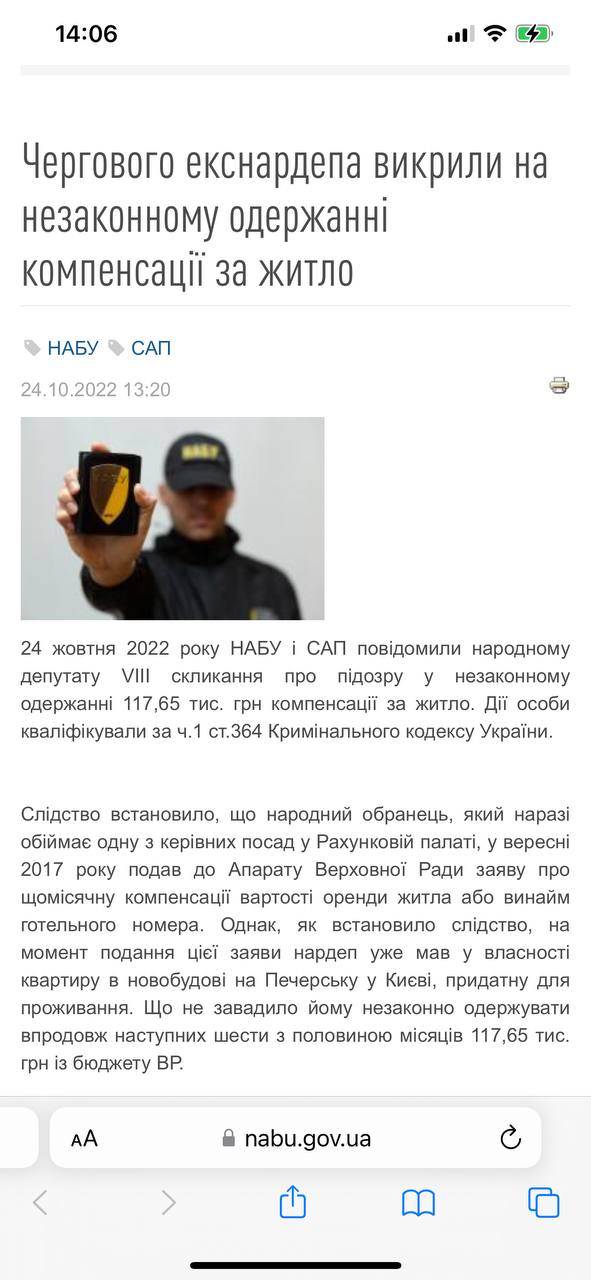 "Следствие установило, что народный избранник, занимающий в настоящее время одну из руководящих должностей в Счетной палате, в сентябре 2017 года подал в Аппарат Верховной Рады заявление о ежемесячной компенсации стоимости аренды жилья или аренды гостиничного номера. Однако, как установило следствие, к моменту подачи этого заявления нардеп уже имел в собственности квартиру в новостройке на Печерске в Киеве, пригодную для проживания", - заявляет НАБУ.