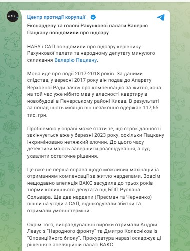 Отметим, что НАБУ не называет фамилию фигуранта, однако Центр противодействия коррупции сообщает, что речь идет о действующем главе Счетной палаты Украины Валерии Пацкане.