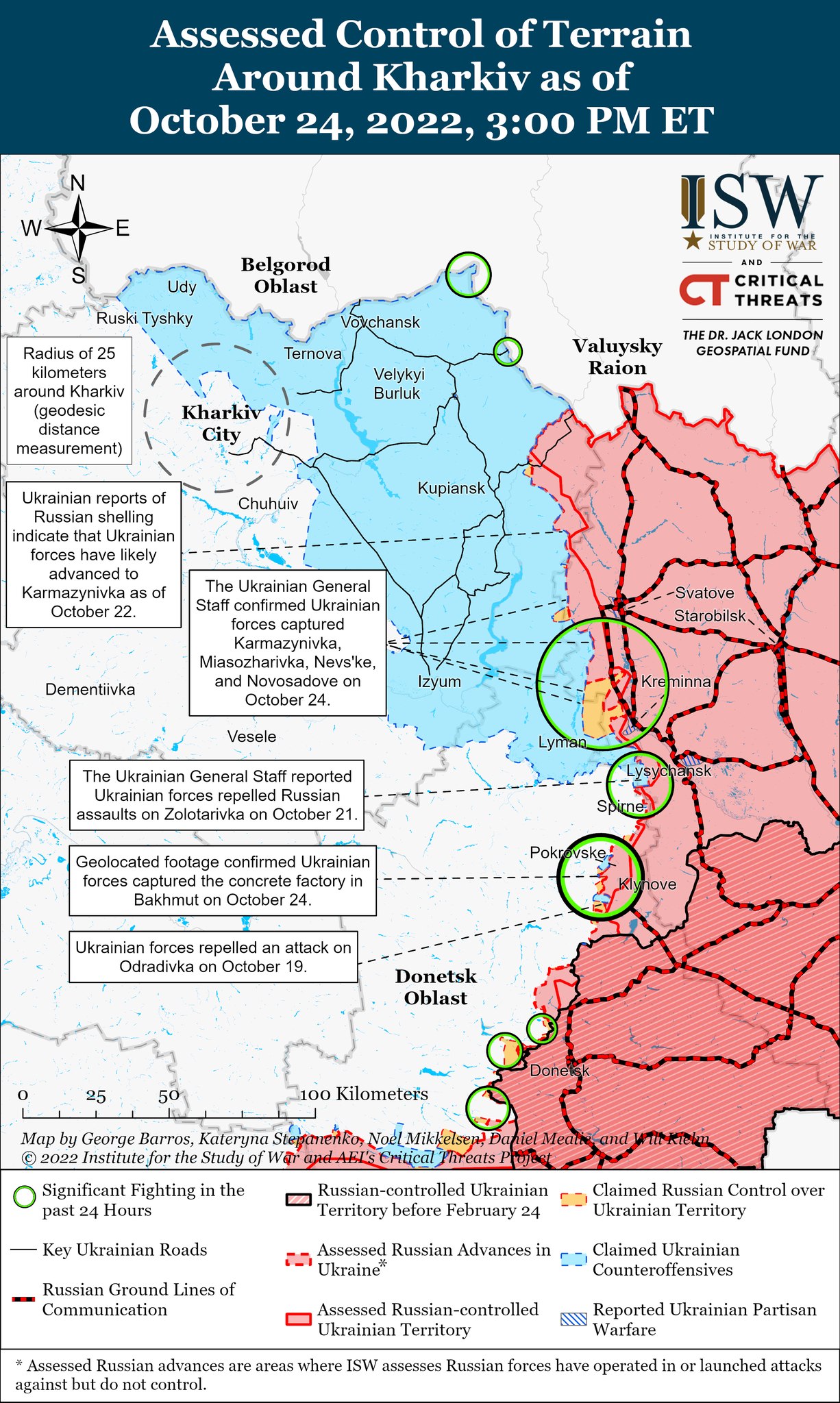 Американский Институт изучения войны 25 октября опубликовал актуальные карты боевых действий в Украине. Сообщается, что Генштаб Украины подтвердил, что ВСУ освободили Кармазиновку, Мясожаровку и Невское в Луганской области и Новосадово в Донецкой области.