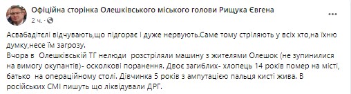 В понедельник, 24 октября, российские военные обстреляли машину с жителями Олешек в Херсонской области. Двое взрослых погибли, ребенок травмирован.