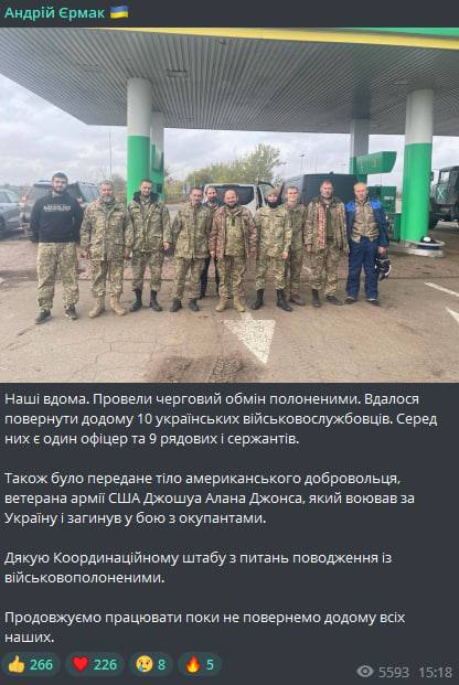 Также было передано тело американского добровольца, ветерана армии США Джошуа Алана Джонса, воевавшего за Украину и погибшего в бою.