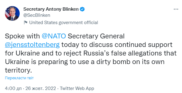 "Общался с Генеральным секретарем НАТО Йенсом Столтенбергом, чтобы обсудить дальнейшую поддержку Украины и отвергнуть ложные утверждения России о том, что Украина готовится использовать "грязную бомбу" на собственной территории", - написал он в Twitter.