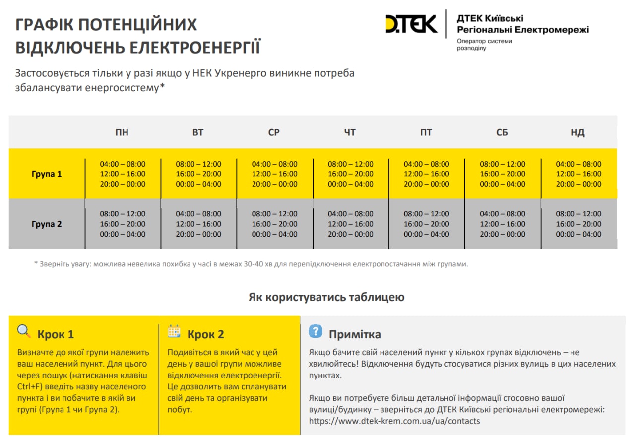 Населенные пункты Киевской области были разделены на две группы. Отключение света будет происходить поочередно и будут длиться в течение 4 часов. Однако возможна небольшая погрешность во времени в пределах 30-40 мин для переподключения электроснабжения между группами.