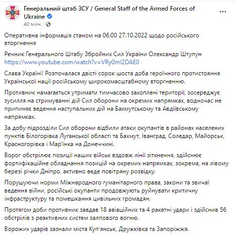 Утром 27 октября Генштаб Вооруженных Сил Украины обнародовал сводку о ситуации на фронте.