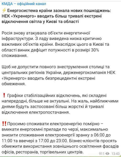 "Необходимо готовиться к экстренным отключениям электричества на неопределенный срок" - сообщил Кулеба.