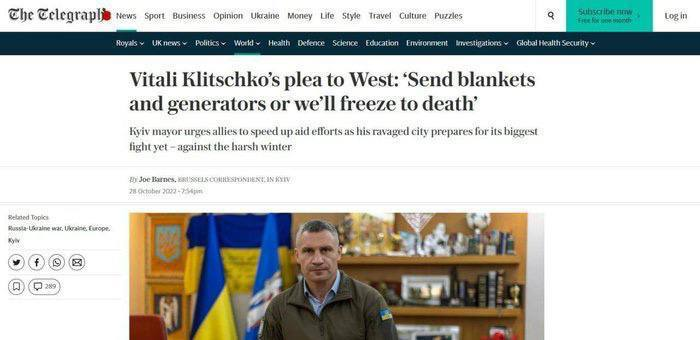 "Пришлите нам одеяла и генераторы, или мы замерзнем до смерти", - такую цитату мэра Киева Виталия Кличко, обращенную к Западу, выносит в заголовок своего материала The Telegraph.