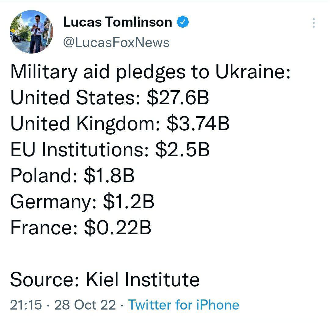 По его сведениям, США уже помогли Украине на сумму 27.6 миллиардов долларов. Это гораздо больше, чем у занимающей второе место Великобритании (3.74 миллиарда).