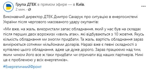 "Мы уже, к сожалению, использовали запас оборудования, который у нас был на складах после первых двух враждебных "волн атак", которые проходят с 10 октября. Какое-то количество оборудования мы смогли приобрести. К сожалению, стоимость оборудования сейчас измеряется сотнями миллионами долларов. Уже есть определенные сложности с покупкой этого оборудования, ведь это очень дорого. Сейчас работаем над тем, как его все же приобрести или получить от наших партнеров. Сейчас это проблема у всех энергетиков", - говорится в сообщении Сахарука.
