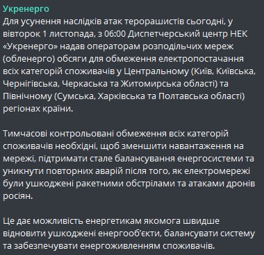 "Укрэнерго" сегодня утром передала в регионы объемы для ограничения электроснабжения всех категорий потребителей в центральной и северной Украине для стабилизации напряжения.