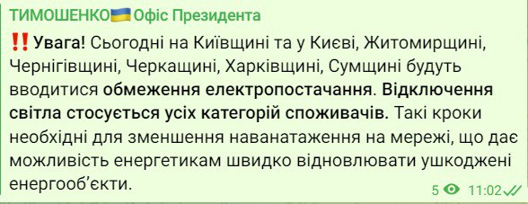 Замглавы Офиса президента Кирилл Тимошенко публикует почти такой же список регионов, где запланированы отключения, но без Полтавской области.