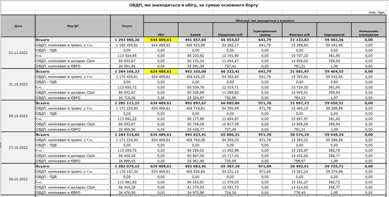 С 31 октября по 1 ноября НБУ выкупил у Министерства финансов ОВГЗ (облигаций внутреннего госзайма) на сумму 10 млрд, совершив, таким образом, прямую эмиссию гривны для нужд госбюджета.