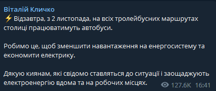 "Делаем это, чтобы снизить нагрузку на энергосистему и экономить электричество. Благодарю киевлян, которые сознательно относятся к ситуации и экономят электроэнергию дома и на рабочих местах", - написал Виталий Кличко.