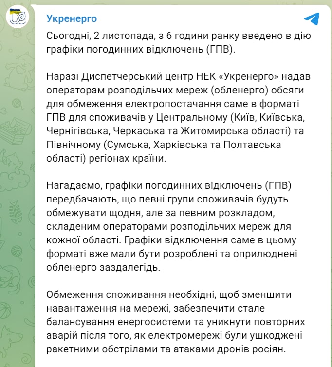 Компания "Укрэнерго" сегодня, 2 ноября, с 6 часов утра ввела в действие графики почасовых отключений в северных и центральных областях Украины.