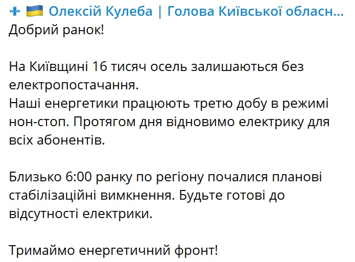 Ранее Кулеба заявлял, что Киевская область может остаться без света на две недели.