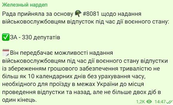Украинским военнослужащим в условиях военного положения будут давать отпуск на 10 суток в год. Плюс максимум четверо суток на дорогу туда и обратно.