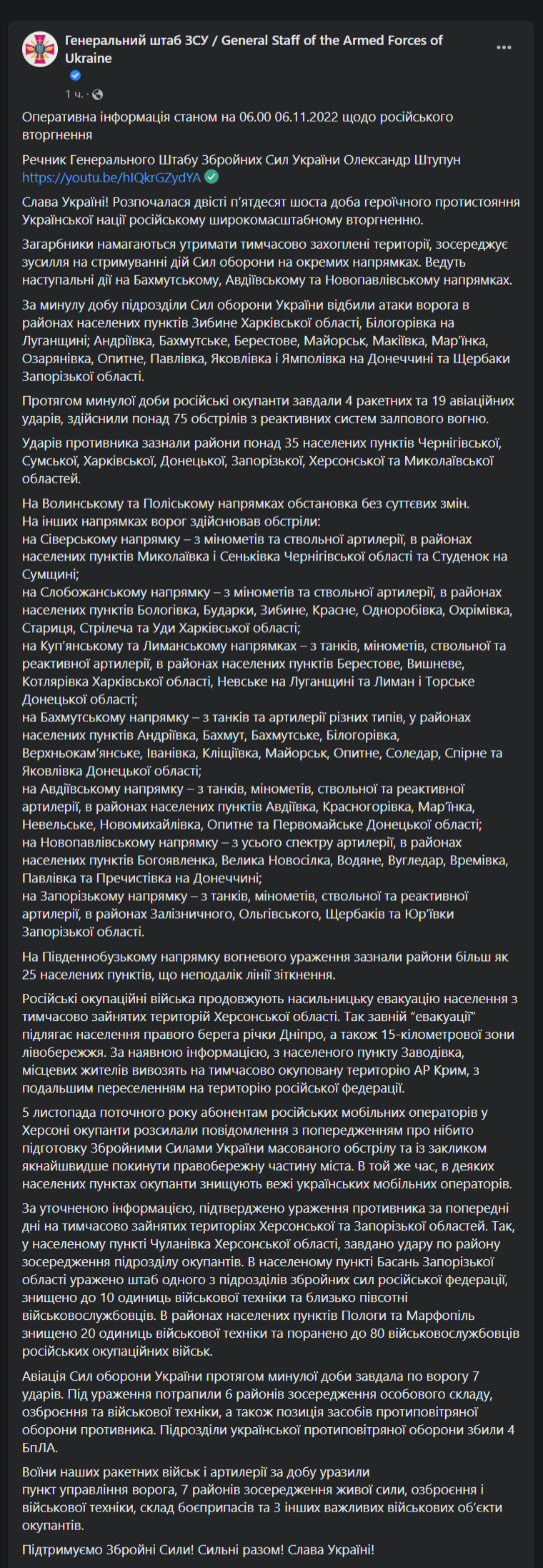 - Противник ведет наступательные действия в Бахмутском, Авдеевском и Новопавловском направлениях. В течение суток противник нанес 3 ракетных и 3 авиационных удара, совершил более 5 обстрелов из реактивных систем залпового огня.