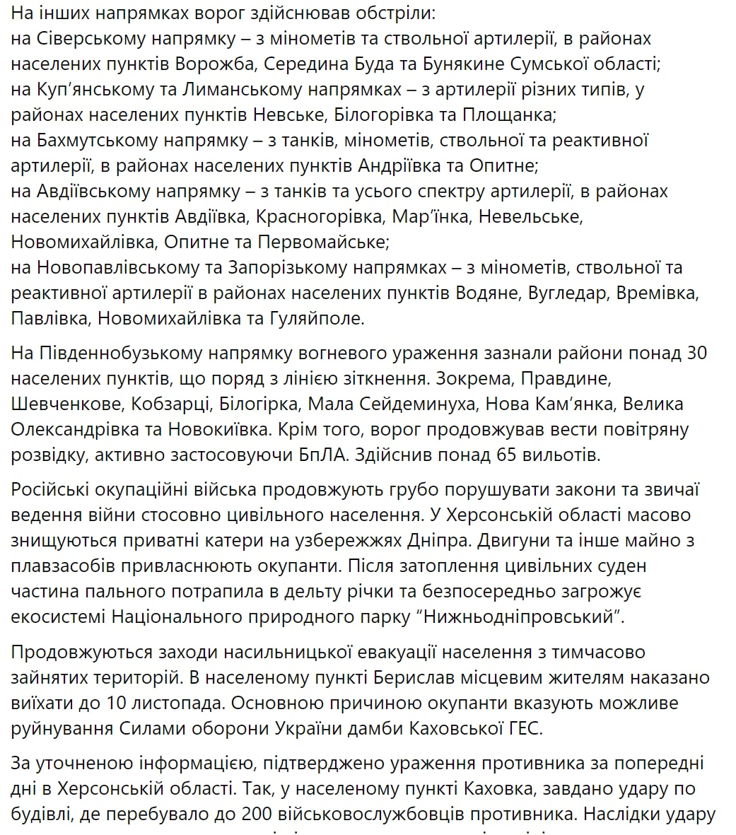 07:30 Сводка украинского Генштаба на утро 6 ноября.