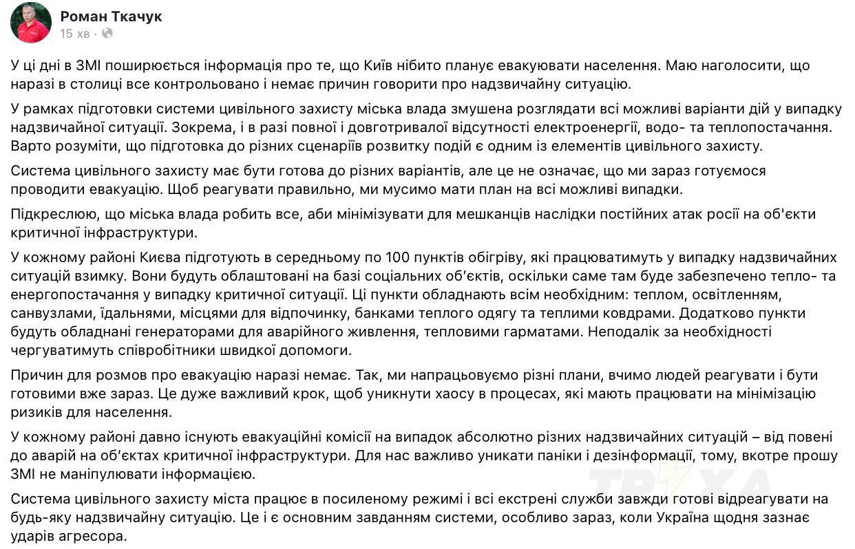 "Система готова к такому шагу, но это не значит, что мы сейчас готовимся проводить эвакуацию", - сказал Ткачук, объяснив, что имел в виду, когда рассказал о возможности полной эвакуации американскому изданию The New York Times.
