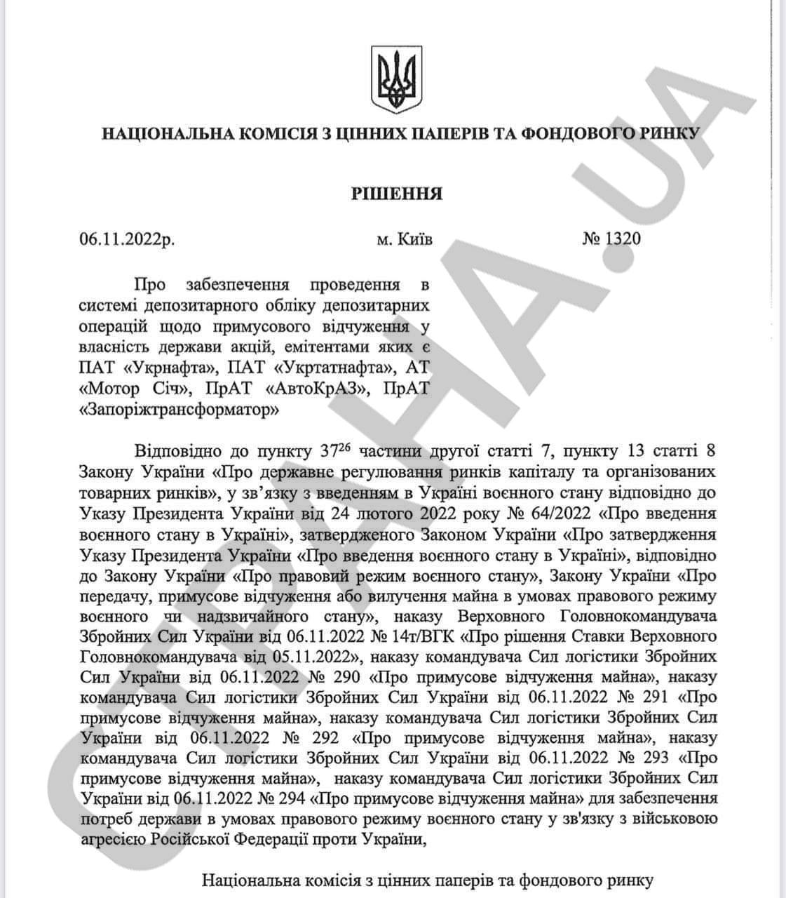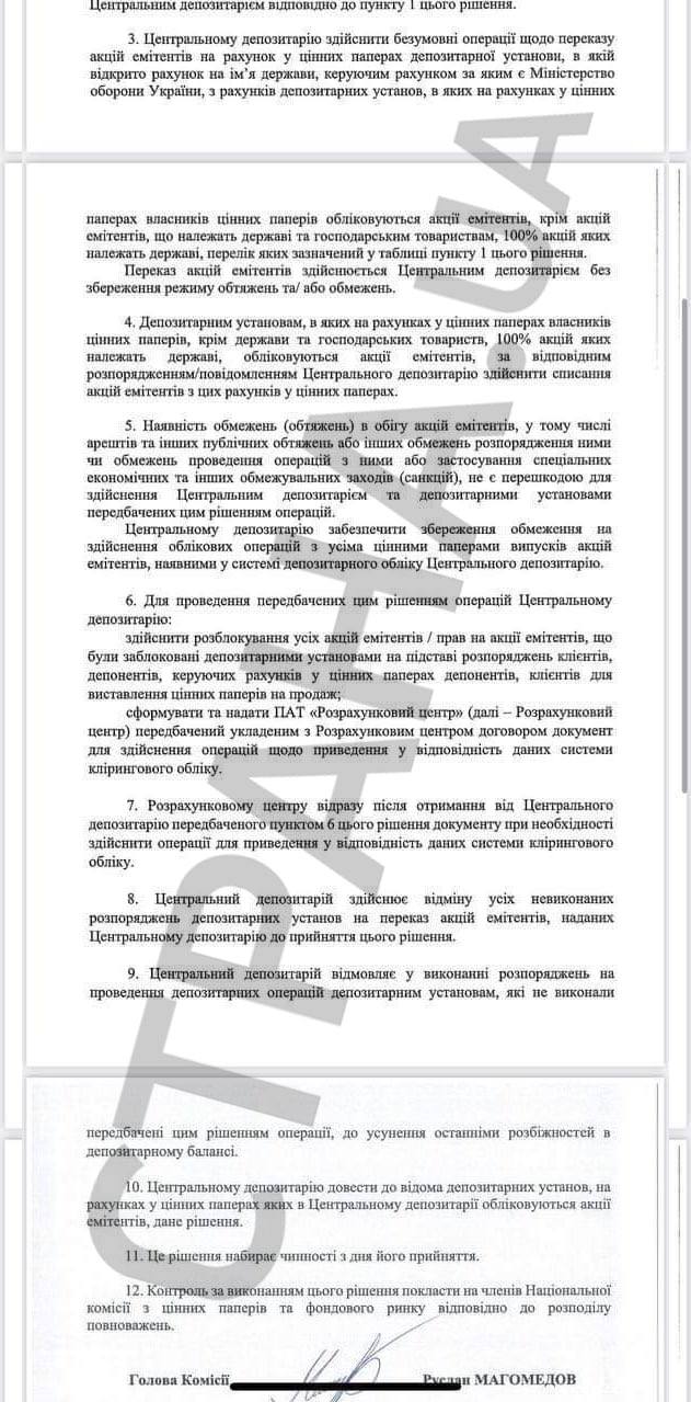 В документе указано, что акции переходят в собственность государства, на основании решения Ставки верховного главнокомандующего и ряда законов о режиме военного положения, в частности, принятый в сентябре закон "О передаче, принудительном отчуждении или изъятии имущества в условиях правового режима военного или чрезвычайного положения".