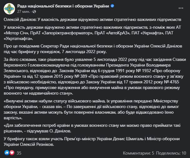 "Укрнафта", "Мотор Сич" и другие национализированные сегодня активы получили статус военного имущества и переданы Минобороны.