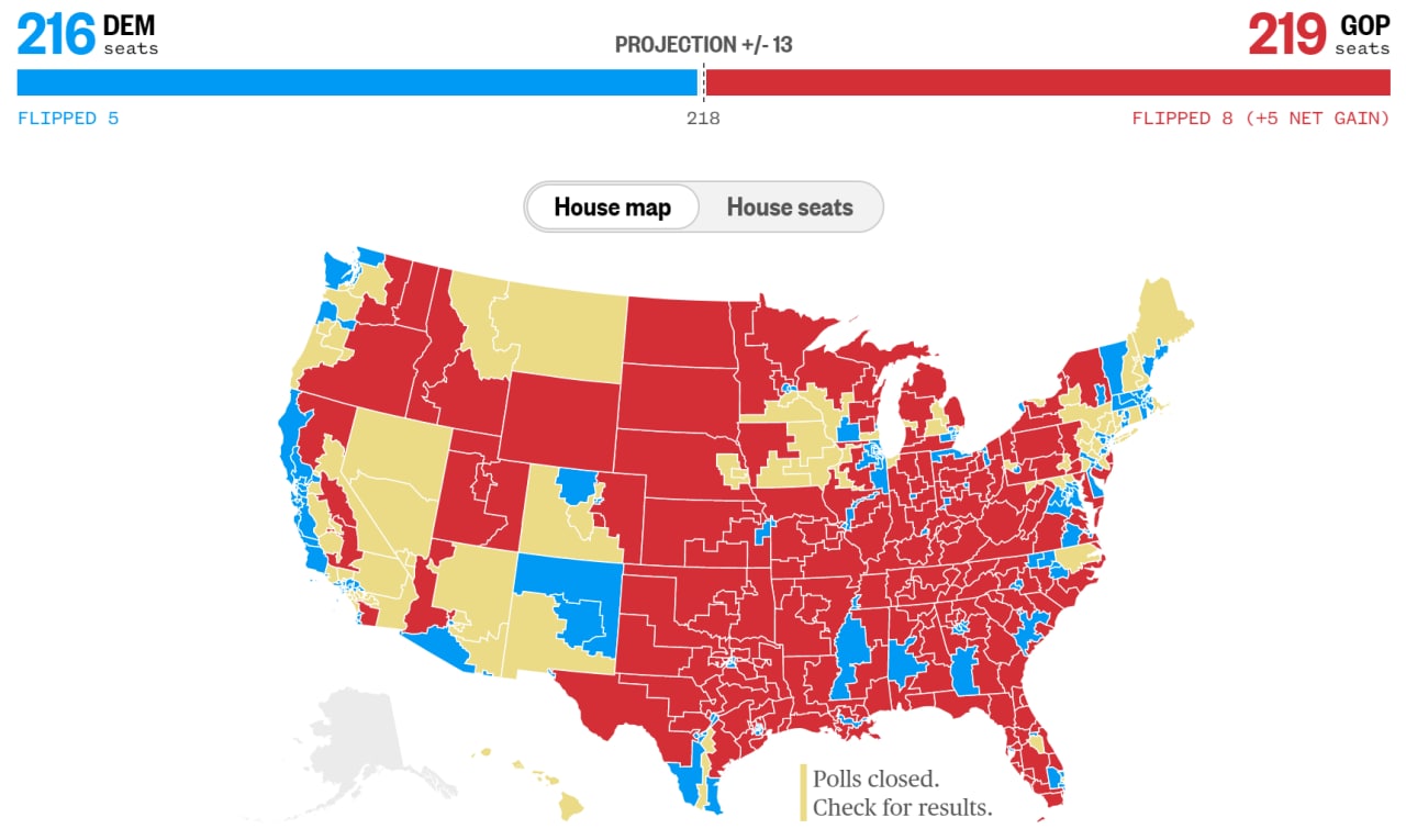 Для большинства республиканцам нужно было взять 218 голосов. Подсчёт голосов ещё продолжается и ситуация может меняться.