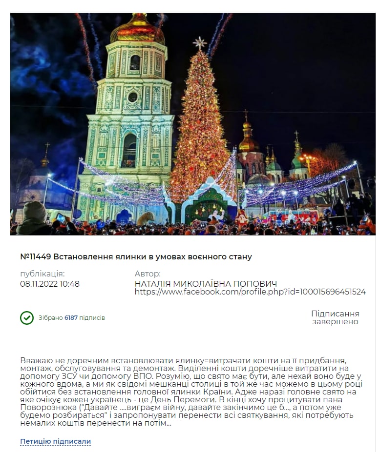 "Считаю неуместным устанавливать елку, тратить средства на ее приобретение, монтаж, обслуживание и демонтаж. Выделенные средства уместнее потратить на помощь ВСУ или ВПО", - заявила автор петиции.