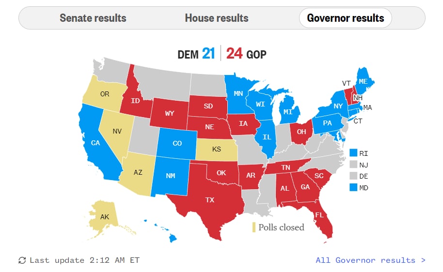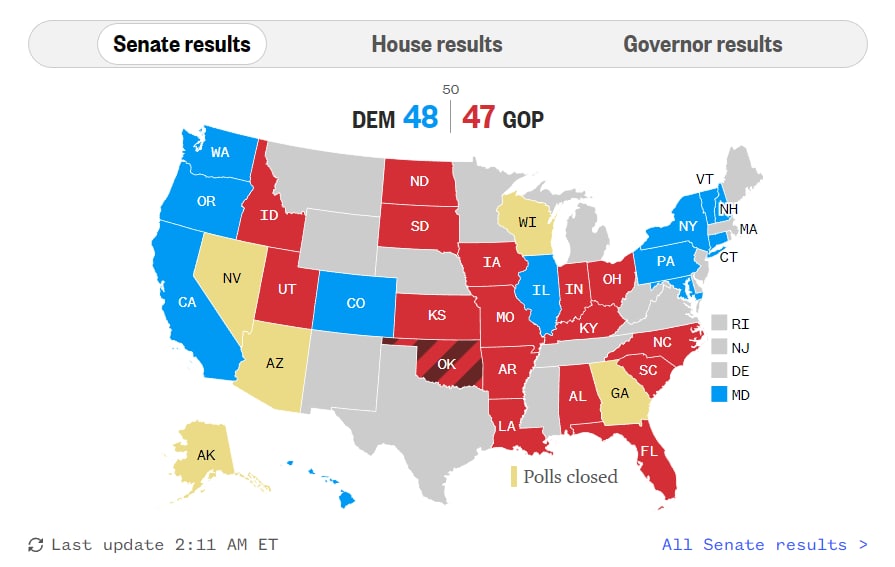 Напомним, по экзитполам республиканцы получают большинство в обеих палатах Конгресса.