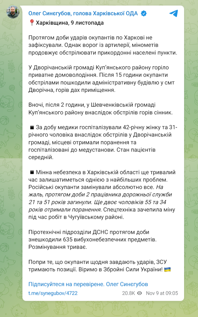 Об этом сообщает в Telegram глава Харьковской ОВА Олег Синегубов.