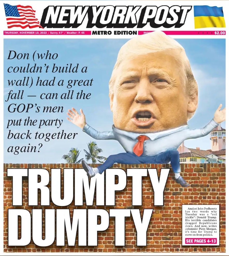 Тем временем внутри республиканской партии начались атаки на Трампа. Близкое к "красным" издание New York Post вышло с карикатурой на экс-президента на первой странице, изобразив его Шалтай-Болтаем (Humpty Dumpty обыграли как Trumpty Dumpty) и вспомнив его обещание о так и не построенной стене на границе с Мексикой.