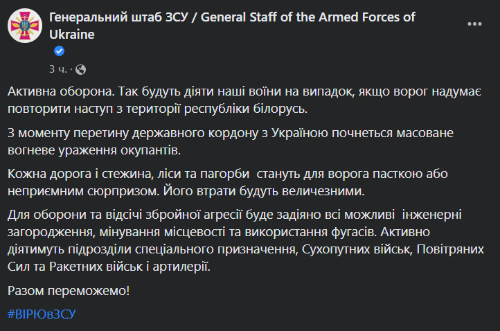 "С момента пересечения государственной границы с Украиной начнется массированное огневое поражение оккупантов. Каждая дорога и тропа, леса и холмы станут для врага ловушкой или неприятным сюрпризом. Его потери будут огромными", - сообщил Генштаб ВСУ.