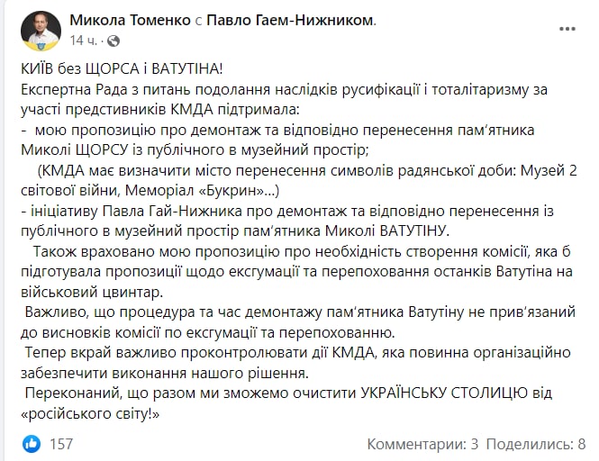 В Киеве планируют демонтировать памятники Щорсу и Ватутину, их перенесут в Музей монументальной пропаганды тоталитарного режима. Такое решение поддержал экспертный совет Минкульта по преодолению последствий русификации и тоталитаризма.