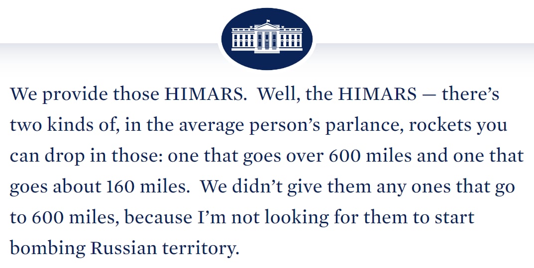 "Мы предоставляем эти HIMARS. Есть два типа, говоря языком среднего человека, ракет, которые вы можете вставить в них: одна пролетает более 600 миль, а другая - около 160 миль. Мы им не давали тех, которые идут на 600 миль (965 км), потому что я не хочу, чтобы они начали бомбить российскую территорию", – сказал Байден на пресс-конференции по итогам выборов Конгресса.