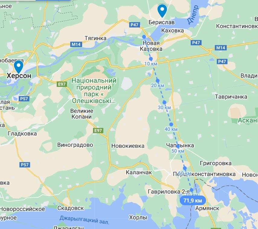 Добавим, что если россияне покинут правый берег Днепра, то граница Крыма и материка будет на расстоянии примерно 72 километров от ближайших позиций ВСУ. При этом дальность ракет MFOM для HIMARS достигает 80 километров.