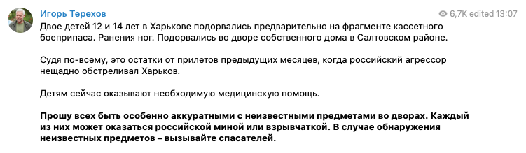 Мэр города Игорь Терехов уточняет, что второму ребенку было 14, а не 15 лет, и подорвались они, предварительно, на фрагменте кассетного боеприпаса, который нашли во дворе собственного дома.