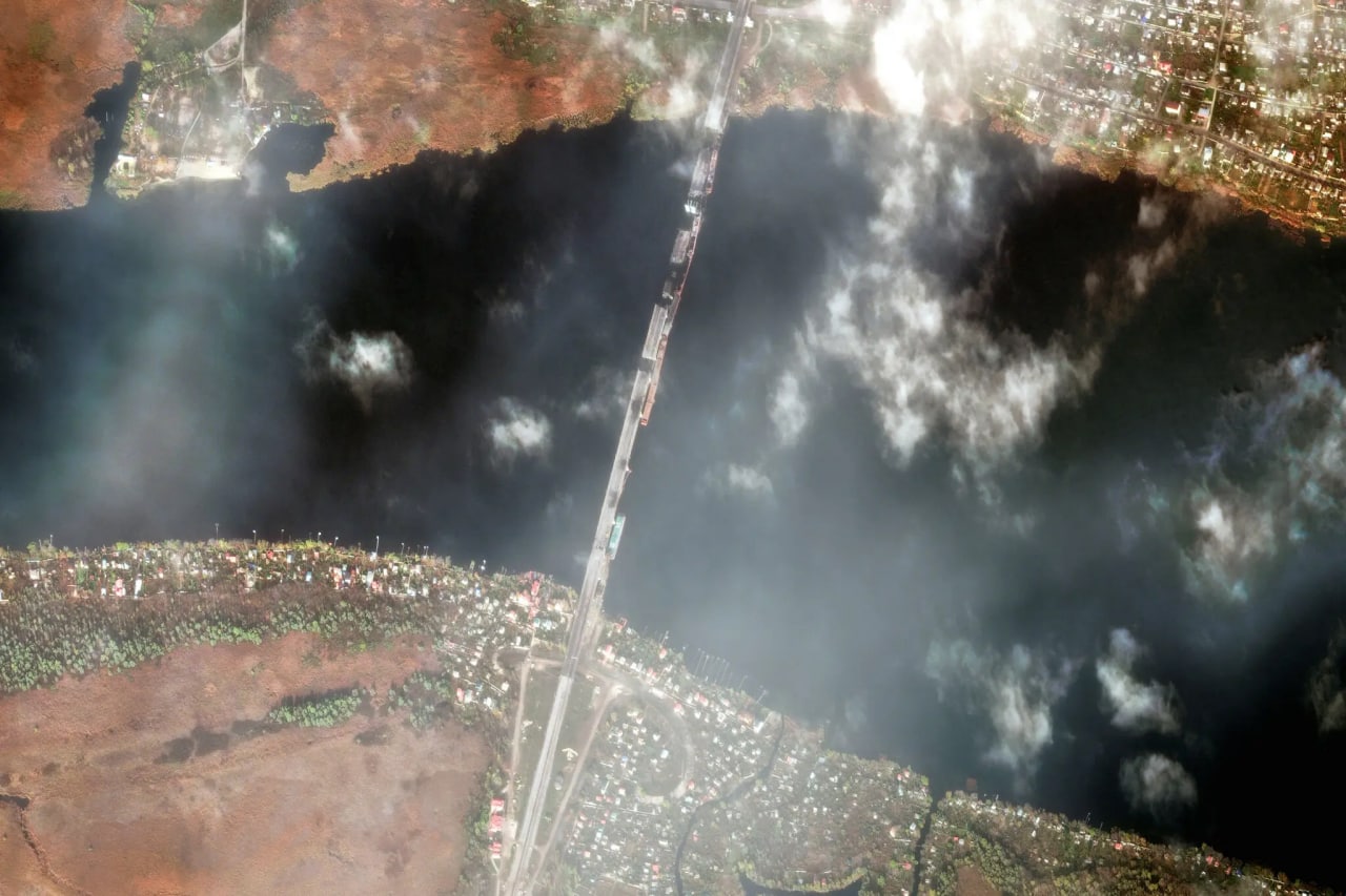 7.49 Как выглядит взорванный Антоновский мост под Херсоном со спутника. Фото Maxar Technologies.