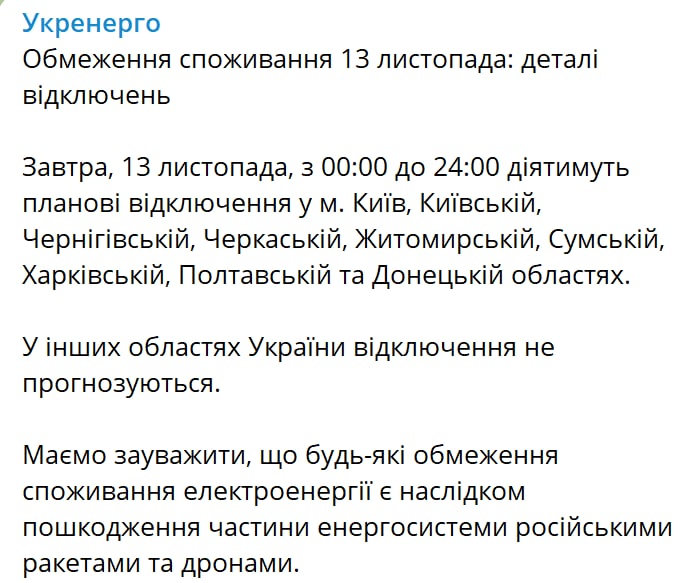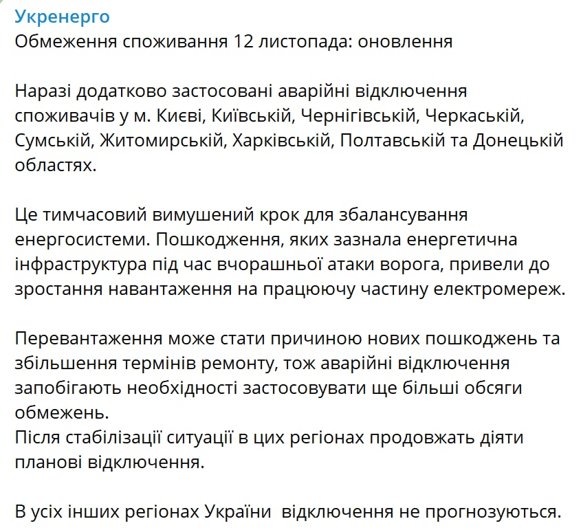 10.20 "Укрэнерго" вводит аварийные отключения в Киеве, Киевской, Черниговской, Черкасской, Сумской, Житомирской, Харьковской, Полтавской и Донецкой областях.