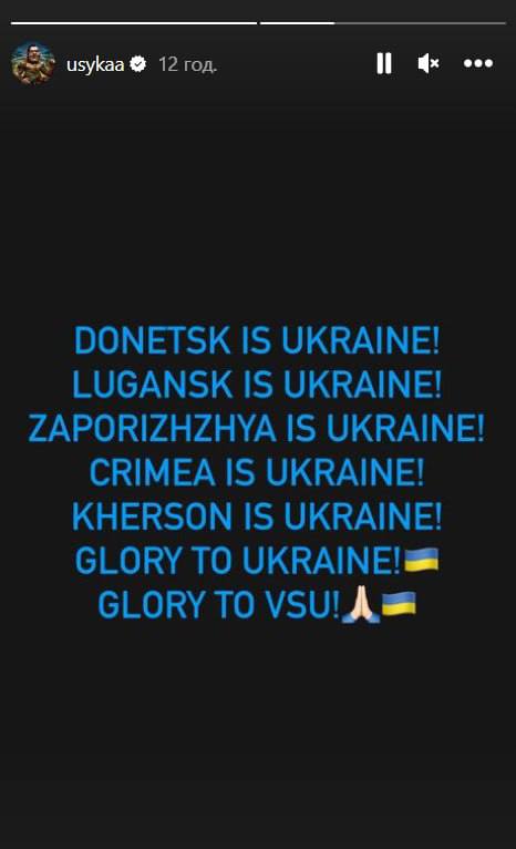 "Донецк - это Украина. Луганск - это Украина. Запорожье - это Украина. Крым - это Украина. Херсон - это Украина. Слава Украине. Слава ВСУ", - написал Усик, не забыв упомянуть в числе принадлежащих Украине территорий свой родной Крым.