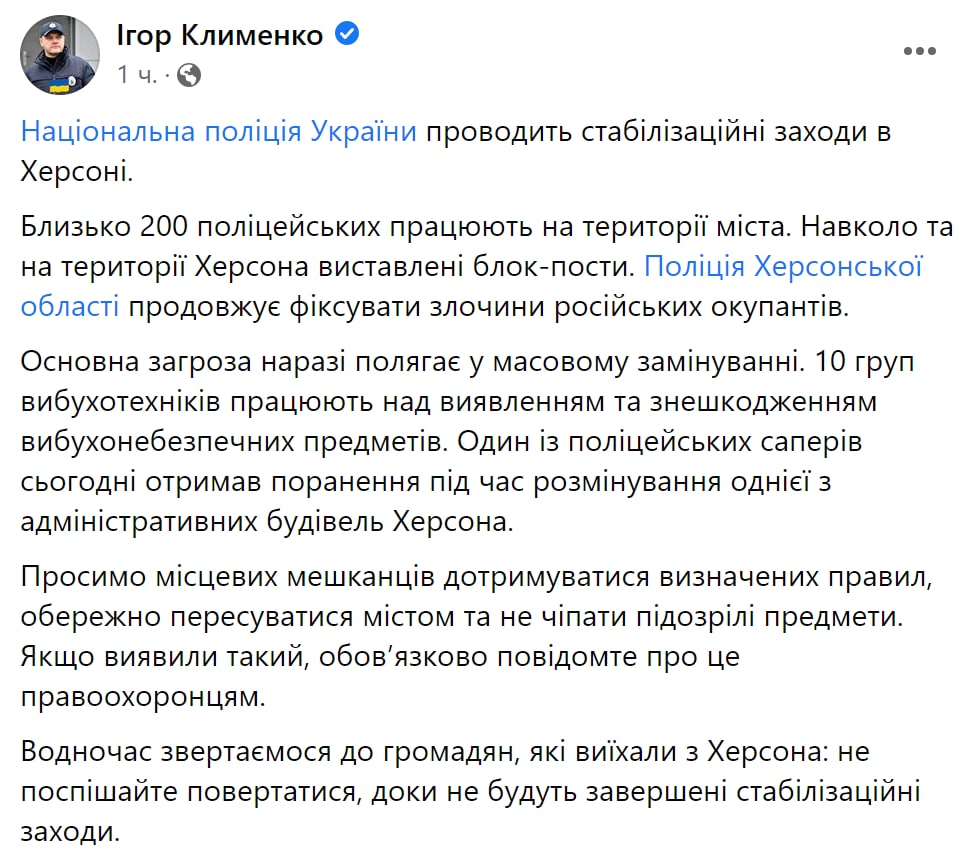 1. В освобожденных населенных пунктах Херсонской области проводятся стабилизационные мероприятия.