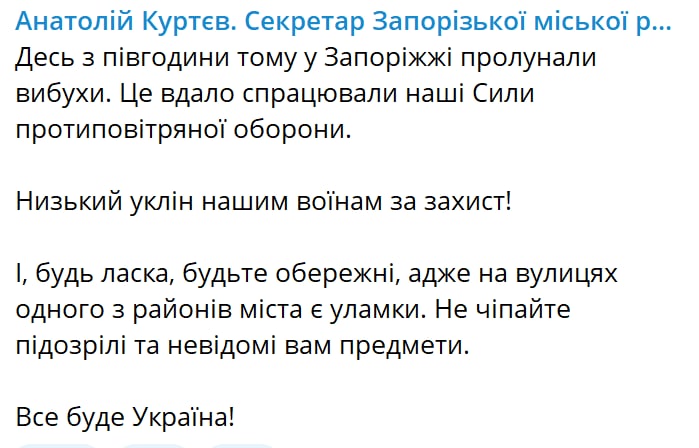 17:12 Взрывы в Запорожье - результат работы ПВО, сообщил секретарь горсовета Анатолий Куртев.