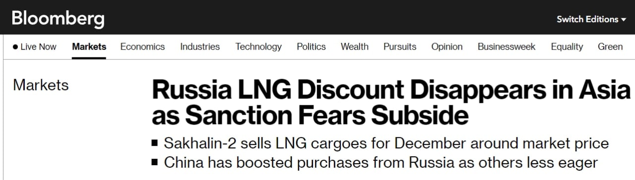 17:41 Сжиженный природный газ из России подорожал и больше не продается со скидками в Азии. Об этом сообщил Bloomberg со ссылкой на источники.