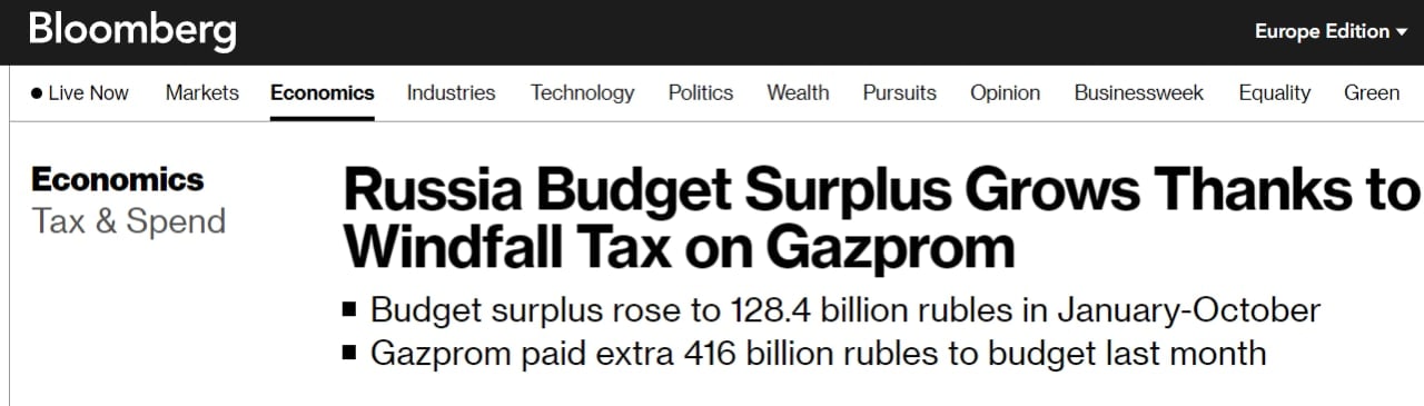 18:51 "Газпром" позволил сохранить российский бюджет в плюсе - увеличение налоговых поступлений от этой госкорпорации позволило сохранить профицит федерального бюджета в октябре, сообщает Bloomberg.