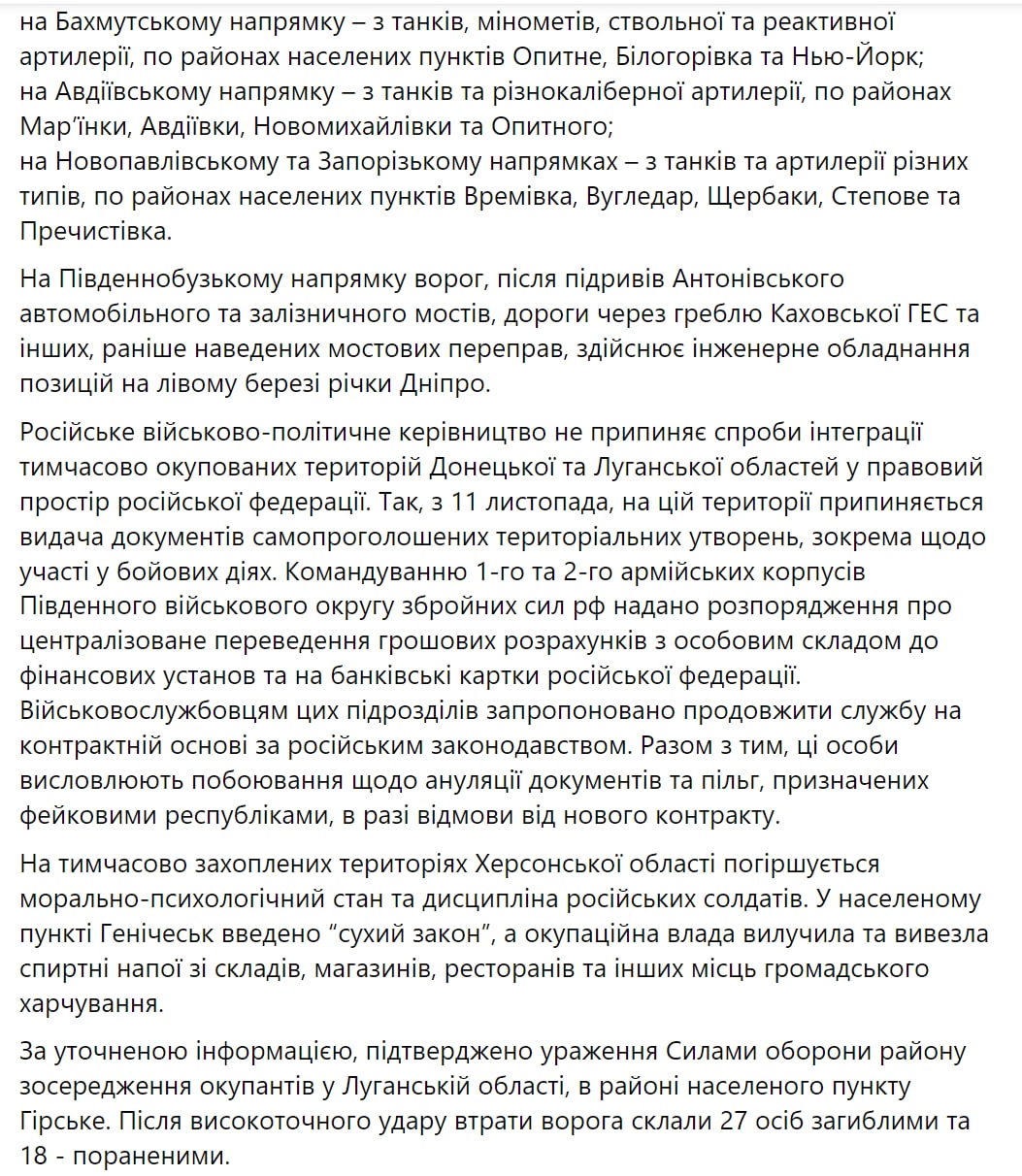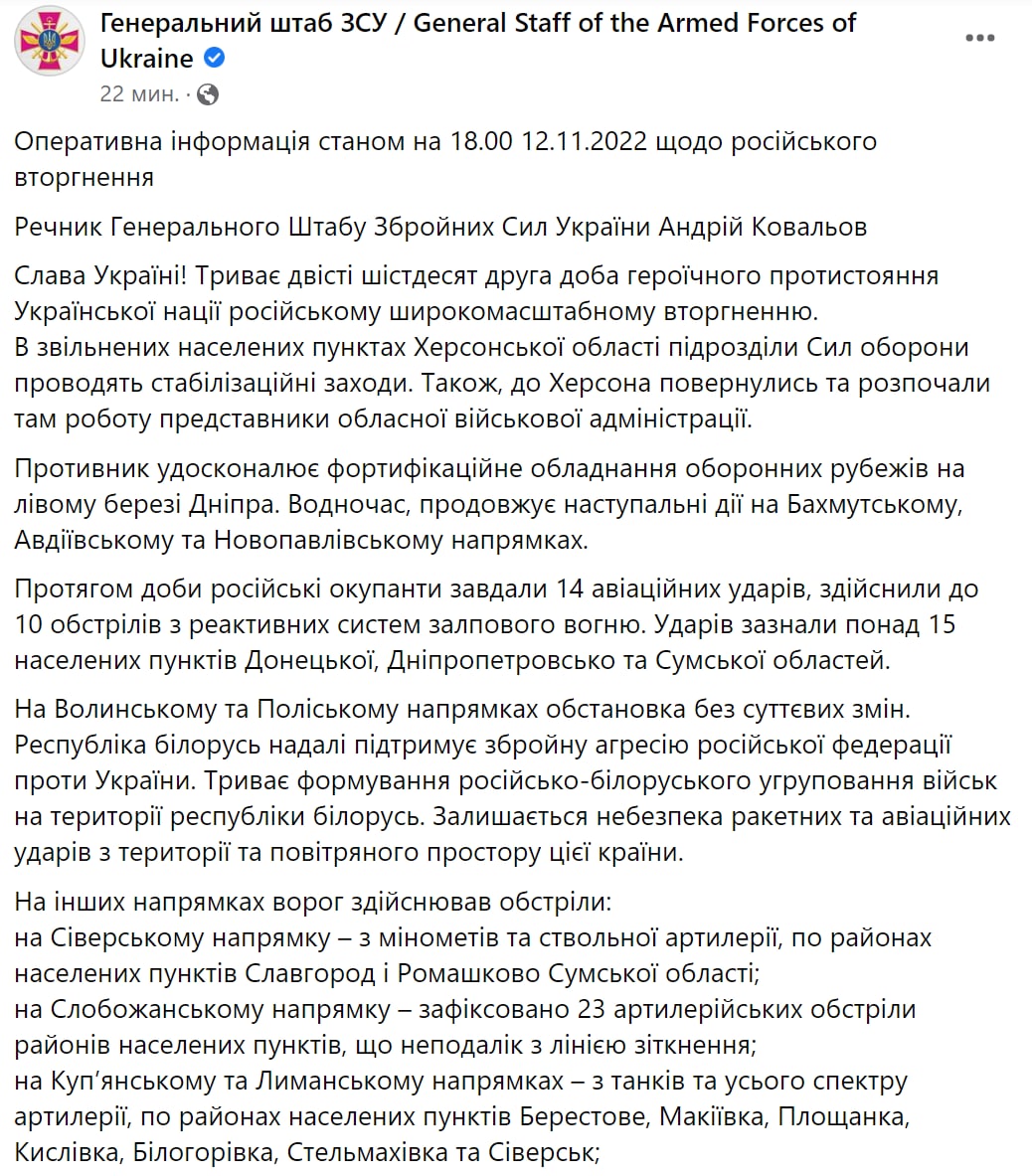 7.22 Сводка украинского Генштаба на утро 12 ноября. Главное: