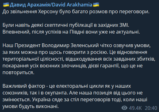 По словам Арахамии, президент Украины озвучил условия для таких переговоров - полное восстановление территориальной целостности Украины, возмещение всех убытков, наказание военных преступников и гарантии, что агрессия больше не повторится.