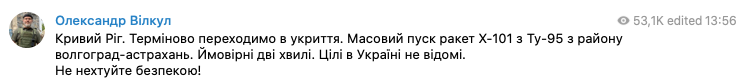 Вслед за ним глава администрации Кривого Рога Александр Вилкул уточнил, что был произведен массовый пуск ракет Х-101 из Ту-95 из района Волгоград-Астрахань.