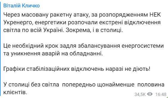 Позже Виталий Кличко сообщил, что без света уже фактически пол Киева. Аварийный отключения - необходимый шаг для сбалансирования энергосистемы и предотвращения поломок оборудования.