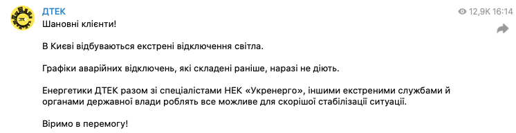Во вторник, 15 ноября, ДТЭК сообщает, что в Киеве после сегодняшних обстрелов вводятся экстренные отключения электричества и плановые графики не действуют.