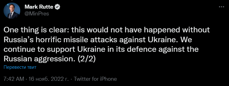 В таком же ключе прокомментировали инцидент Нидерланды. Премьер-министр Нидерландов Марк Рютте написал в Twitter: "Очевидно одно: этого не произошло бы, если бы не ужасные ракетные удары РФ против Украины".