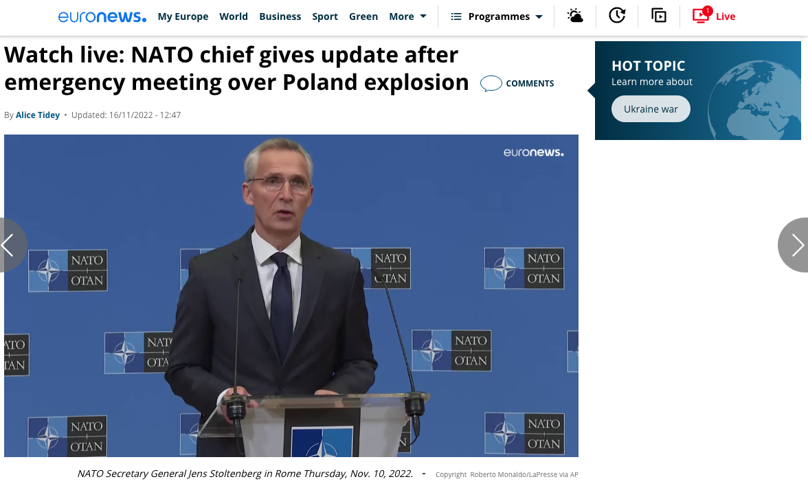 Генсек НАТО Йенс Столтенберг заявил, что, по предварительной информации, в Польше упала ракета украинской ПВО. Первым об этом официально заявил президент Польши.